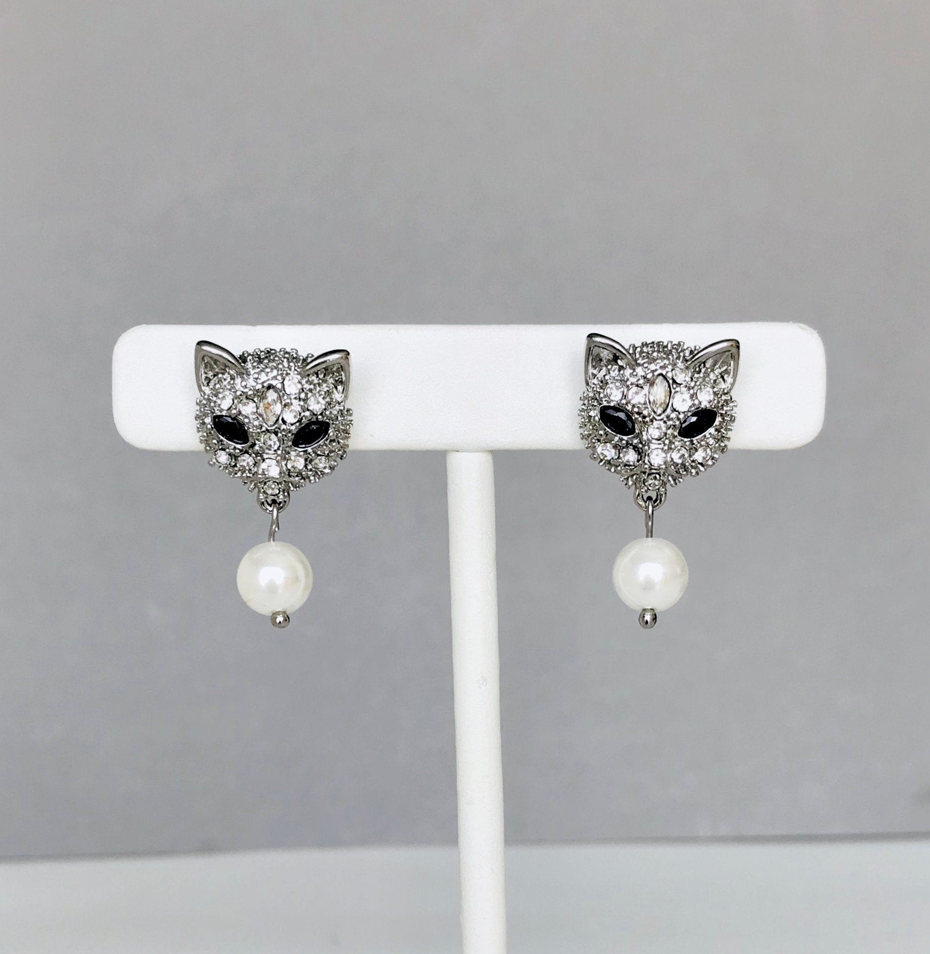 Crystal cat pearl drop earrings