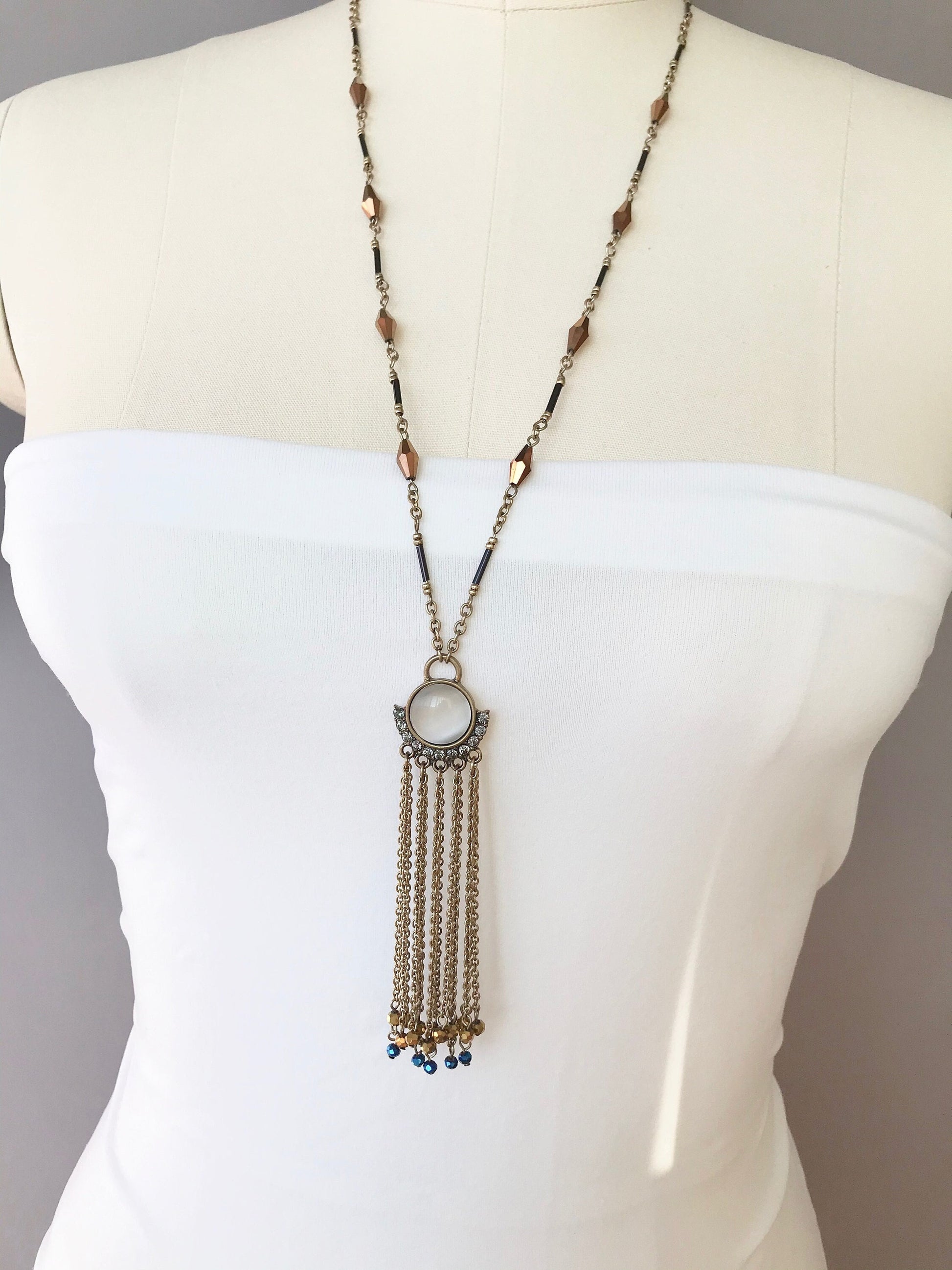 A gorgeous boho style statement necklace with the perfect contrast of glass beads, bronze metal, crystals, and chains.