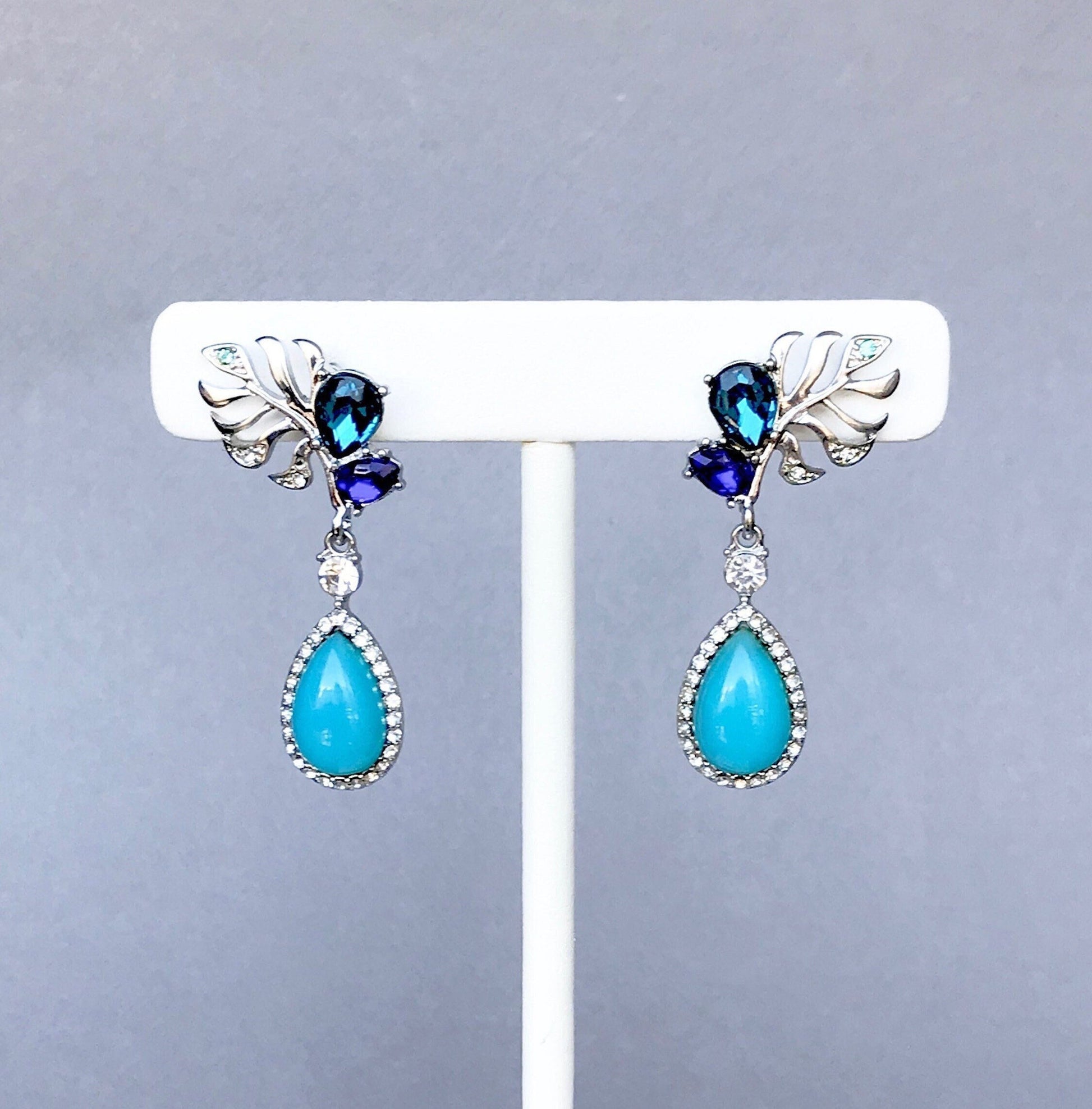 Turquoise blue statement earrings, unique design leaves earrings, crystal drop earrings, blue earrings, LIMITED EDITION